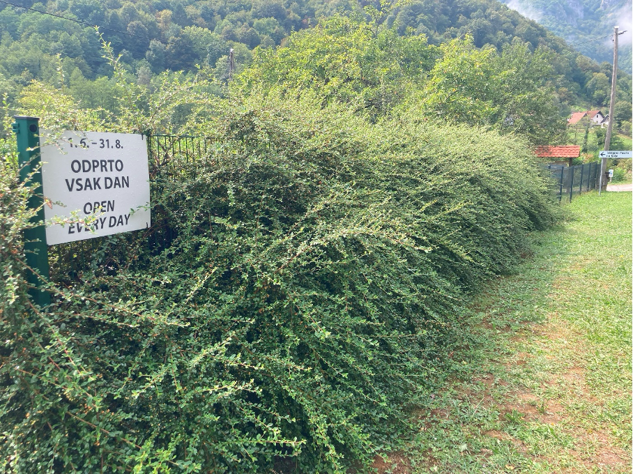 Did migration then end with the fence? No, the young woman assured us. There are still people crossing, sometimes they sit in front of her door and ask her to call the police who then bring them to an asylum centre in Ljubljana. Thus, the migration phenomenon remains, but the border spectacle vanished in thin air with the dismantling of the fence. She also stated that there were still some relics of the fence visible, at the café close to the bridge down at the riverside. Indeed – she hinted at the same café we met our waitress denying the existence of a fence. Indeed, there we found it, in a friendly green reincarnation, the 2,5m high fence continued to exist. A signpost indicated that the once hard border is now open every day for customers buying a coffee or enjoying a lunch.